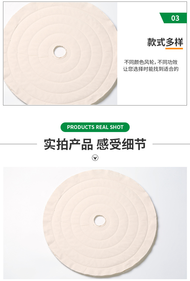 3)風(fēng)冷布輪。采用45度角線(xiàn)裁法,呈環(huán)形皺褶狀,中間裝有金屬圓盤(pán),具有通風(fēng)散熱的特點(diǎn),宜拋光大型工件。