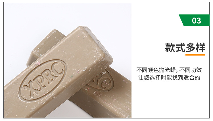 一般情況下用不同的顏色表示不同品種的拋光臘,避免使用時混亂。高含量的磨料可以加速整個拋光過程。這個過程是拋光臘拋光輪表面移動而使材料變得光滑。